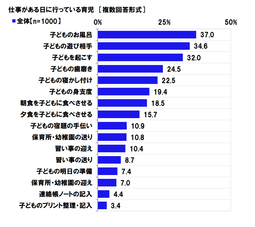 全回答者(1,000 名)に、仕事がある日に行っている家事を聞いたところ、「ゴミを出す」(62.5%)が最も高く、次いで、「ゴミをまとめる」(43.1%)、「夕食の食器洗い」(37.3%)、「お風呂の掃除」(36.1%)、「洗濯物を干す」(33.6%)となりました。